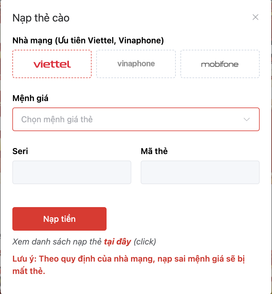 Nạp Tiền bằng Thẻ Cào: Đầu tiên, bạn cần mua một thẻ cào với mệnh giá tương ứng với số tiền mà bạn muốn nạp vào tài khoản. Sau đó, bạn đăng nhập vào tài khoản của mình trên trang web của chúng tôi, chọn phần "Nạp Tiền" và nhập mã số của thẻ cào. Hệ thống sẽ tự động cộng tiền vào tài khoản của bạn.